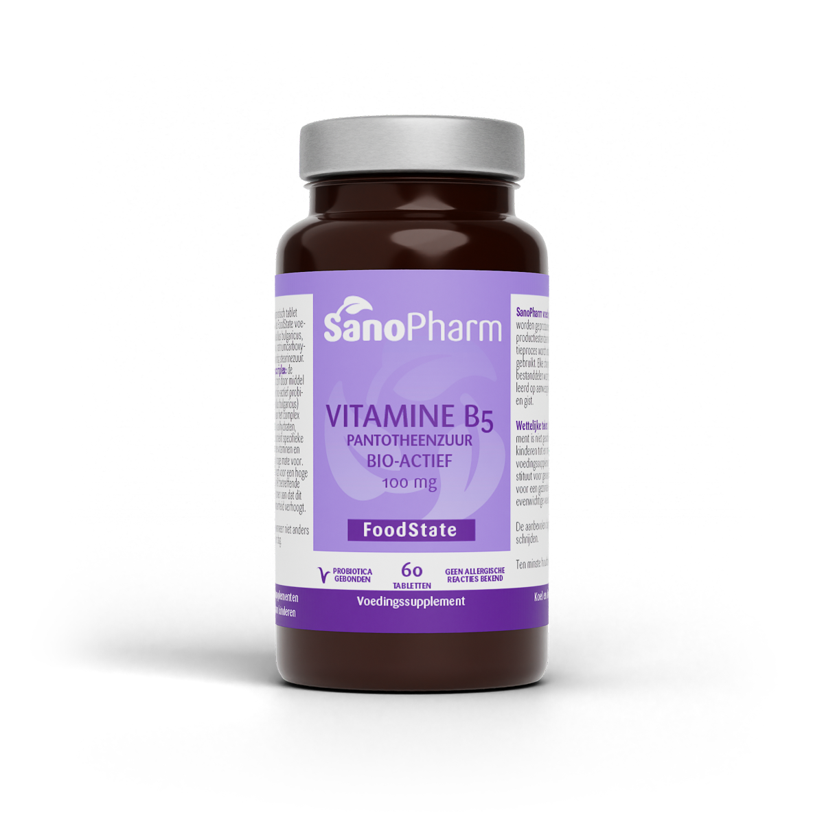 Pantotheenzuur is oplosbaar in water. Het komt voor in alle levende cellen. Het stimuleert de bijnieren en verhoogt de productie van cortison en andere bijnierhormonen die van belang zijn voor een gezonde huid en gezonde zenuwen. De vitamine speelt een essentiële rol in de celstofwisseling. Pantotheenzuur neemt, evenals de eerste drie B-vitaminen, deel aan het vrijmaken van energie uit koolhydraten, vetten en eiwitten. Het is essentieel voor de synthese van cholesterol, steroïden en vetzuren en helpt bij het gebruik van andere vitaminen, met name van riboflavine. Het houdt het spijsverteringskanaal gezond en helpt het lichaam om stress te weerstaan.