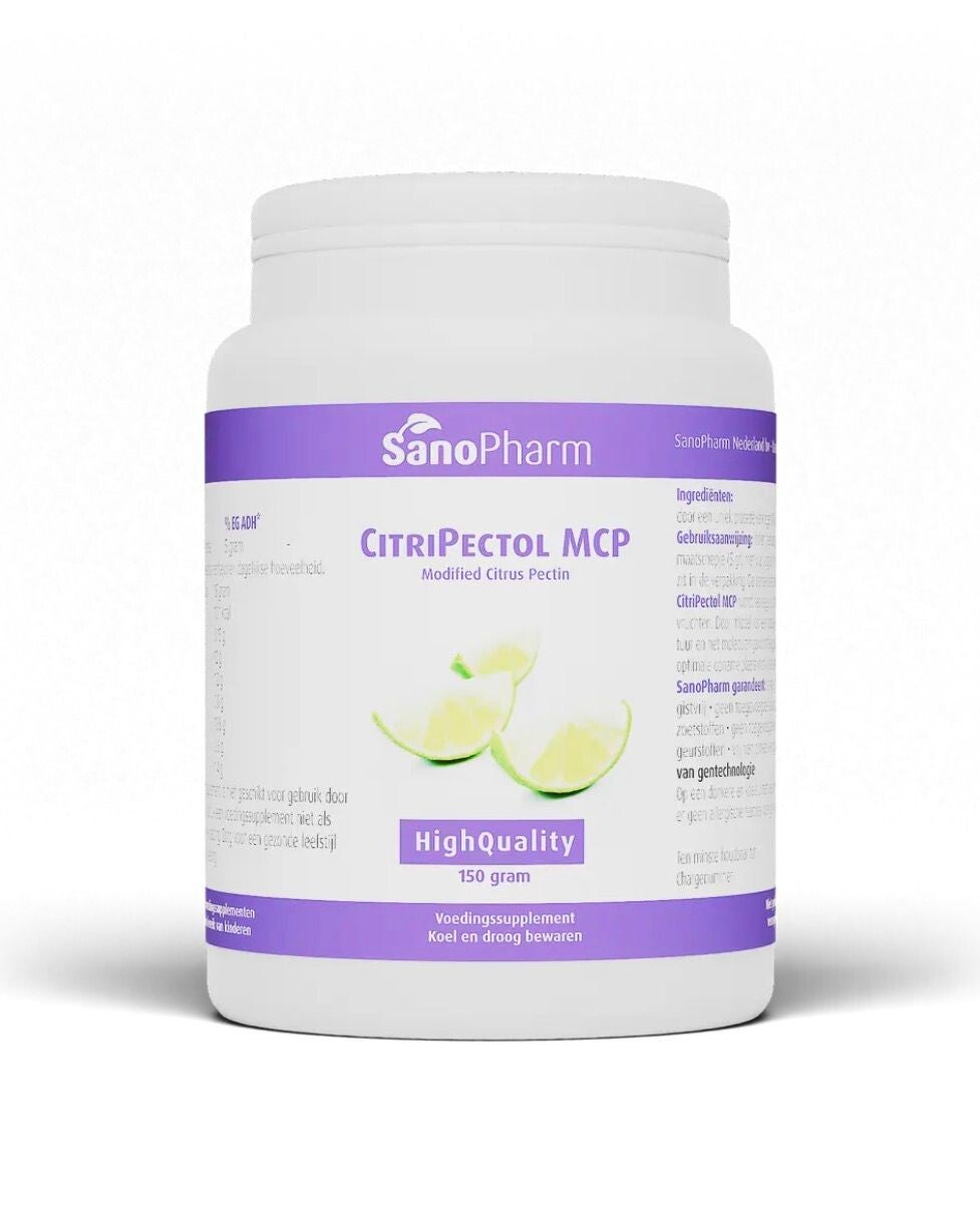 AlgemeenHet preparaat CitriPectol MCP bestaat uit gemodificeerde citruspectine (modified citrus pectin). Citruspectine is een gelvormende polysacharide die wordt gewonnen uit het merg van de schillen van citrusvruchten. Bij de citrussuikers die in citruspectine aanwezig zijn, kunnen we onderscheid maken in homogalacturonaan en rhamnogalacturonaan. Homogalacturonaan bevat vooral galacturonzuur, rhamnogalacturonaan bevat naast galacturonzuur ook veel verschillende monosachariden zoals galacturonzuur, rhamnose, galactose, xylose en arabinose. Recent wetenschappelijk onderzoek heeft aangetoond dat citruspectine zich kan binden aan galectine-3 en dat het de werking van dit eiwit blokkeert. Omdat citruspectine in zijn oorspronkelijke vorm niet of nauwelijks wordt opgenomen door het lichaam – het zijn een soort taaie voedingsvezels – is de citruspectine in CitriPectol gemodificeerd. De kleinere moleculen van gemodificeerde citruspectine bestaan voor het grootste deel uit D-polygalacturonaat en worden goed opgenomen door het spijsverteringsstelsel van de mens.